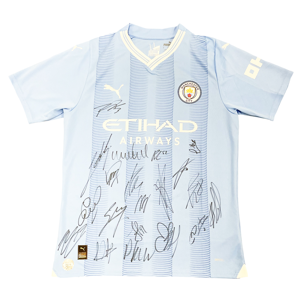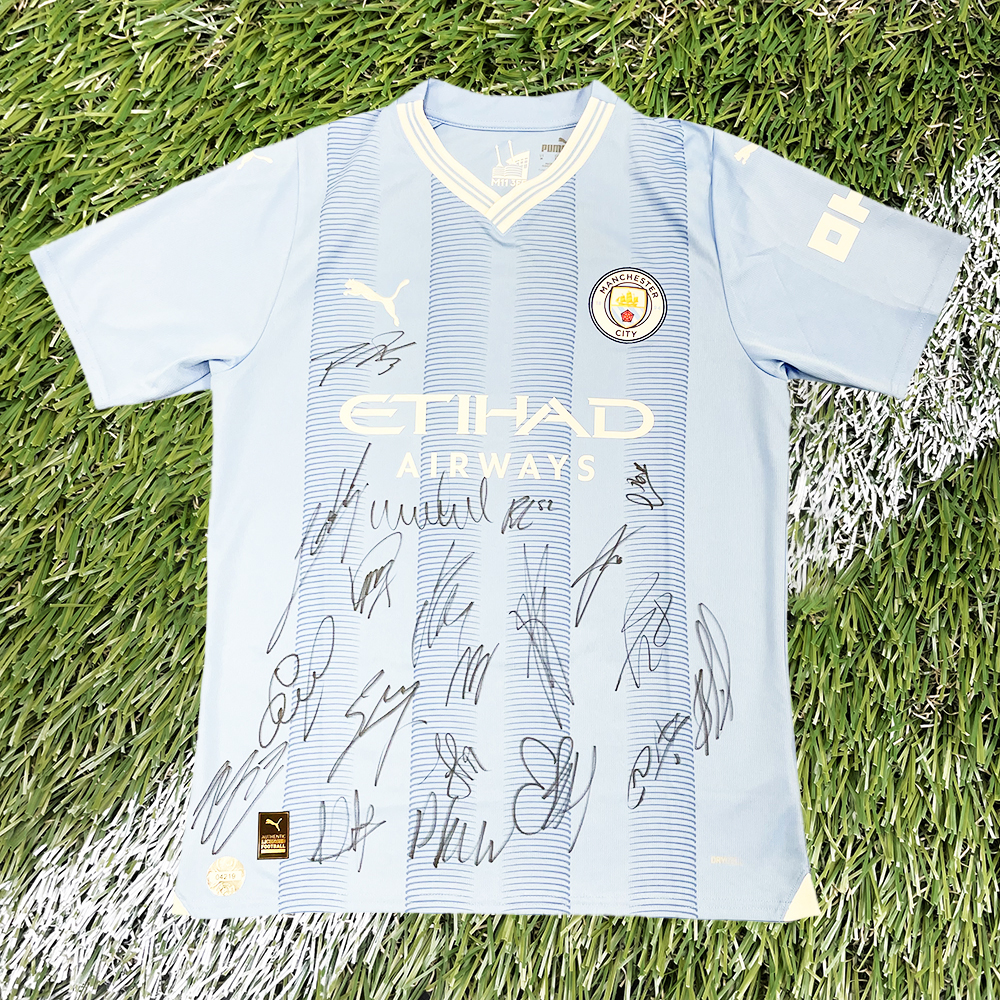 Signed Manchester City shirt, autographed by the stellar team. The iconic blue hand-signed jersey comes unframed but several framing options are available on the page that can be