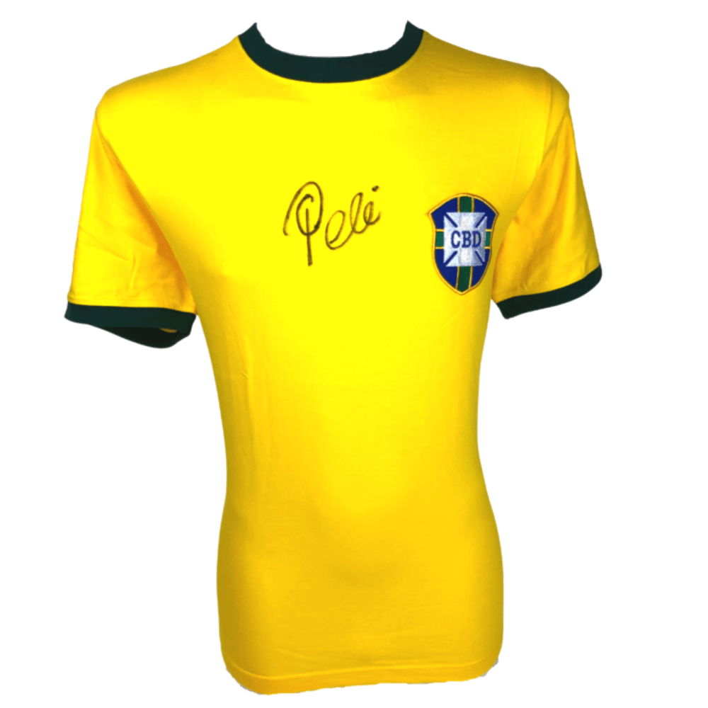 Iconic Signed Pele Shirt – World Cup Winner 1970 Autograph. Framing is available by choosing from the drop-down menu the classic or premium version. Outstanding yellow jersey with black trim and Pele autograph in black marker and club badge.